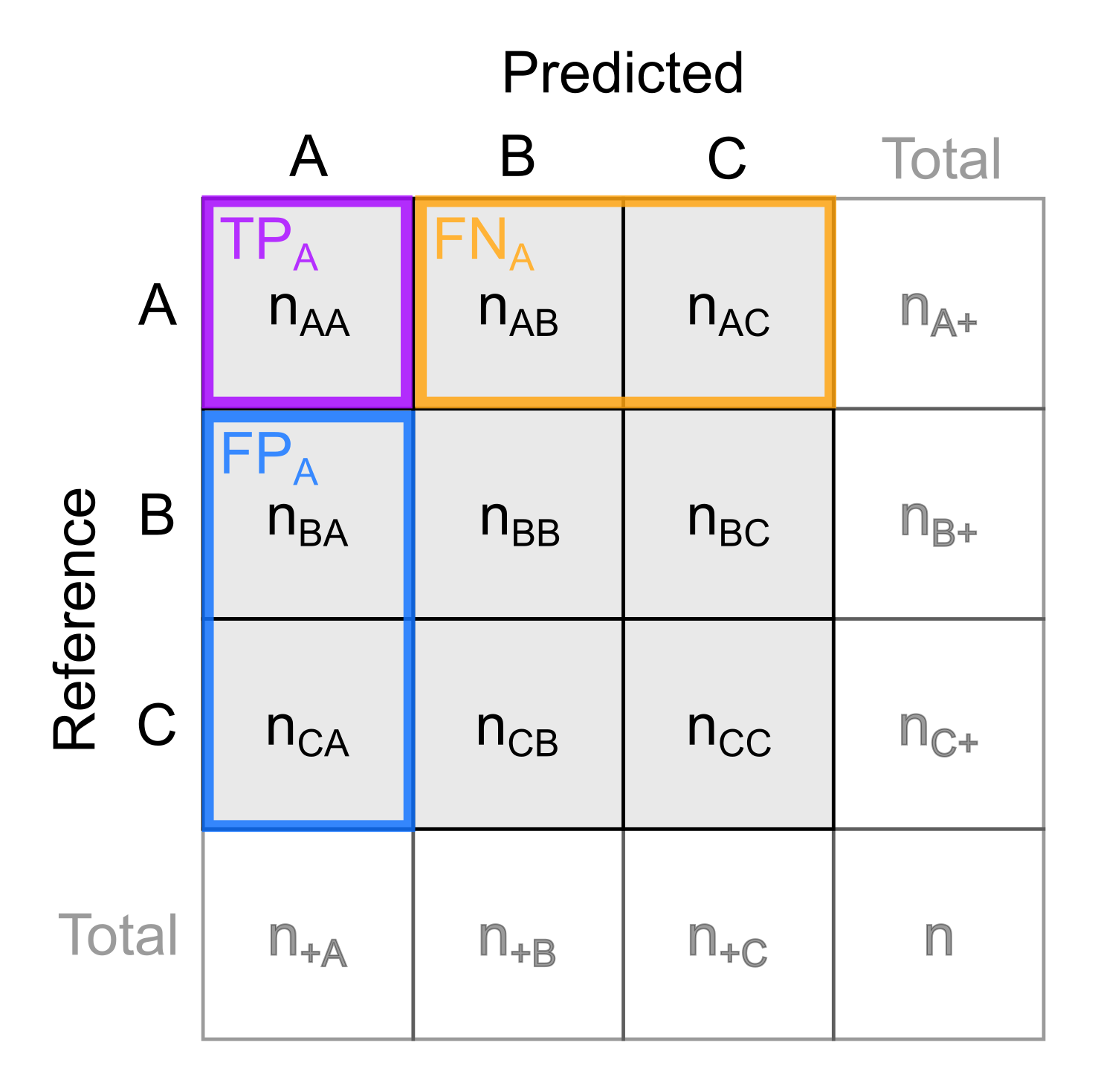 In the matrix above, nij is the number of samples labelled as class i in the reference and predicted as class j by the model. ni+ is the total number of samples actually being class i, n+i is the total number of samples predicted as class i, and n is the total number of samples.